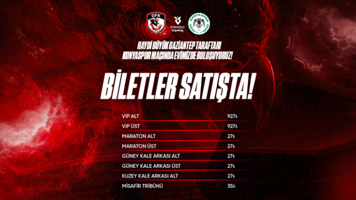 Gaziantep FK, Trendyol Süper Lig’in 19. haftasında 25 Ocak Pazar günü saat 14.30’da konuk edeceği Tümosan Konyaspor maçının biletlerini satışa çıkardı.