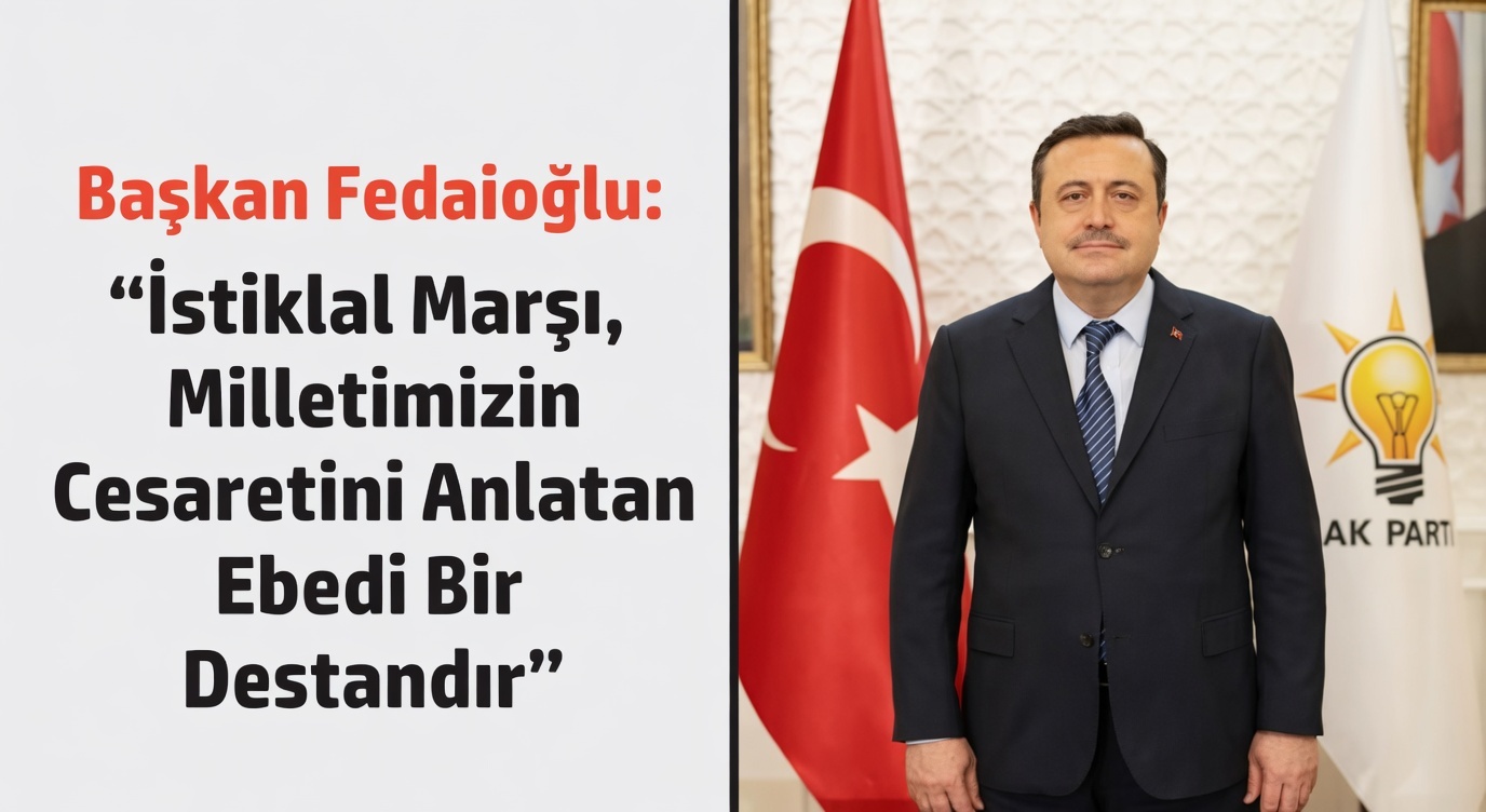 Başkan Fedaioğlu mesajında, “İstiklal Marşı’mız, aziz milletimizin yokluklar içinde verdiği Kurtuluş Mücadelesi’nin imanla, azimle ve büyük fedakârlıklarla kazanıldığının en güçlü nişanesidir. Mehmet Akif Ersoy, kaleme aldığı bu büyük eserle sadece bir şiir yazmamış; milletimizin karakterini, inancını ve bağımsızlık tutkusunu mısralara işlemiştir. İstiklal Marşı, vatan sevgisinin, millet olma bilincinin ve özgür yaşama kararlılığının nesilden nesile aktarılmasını sağlayan eşsiz bir mirastır. Bizlere düşen en büyük görev; ecdadımızın emanet ettiği bu vatanın kıymetini bilmek, birlik ve beraberliğimizi güçlendirmek ve Türkiye’yi her alanda daha güçlü yarınlara taşımak için var gücümüzle çalışmaktır. Bu anlamlı gün vesilesiyle başta Cumhuriyetimizin kurucusu Gazi Mustafa Kemal Atatürk olmak üzere, Kurtuluş Savaşı’nın tüm kahramanlarını, aziz şehitlerimizi ve Milli Şairimiz Mehmet Akif Ersoy’u rahmet, minnet ve şükranla anıyorum. Allah bu millete bir daha İstiklal Marşı yazdırmasın” ifadelerini kullandı.