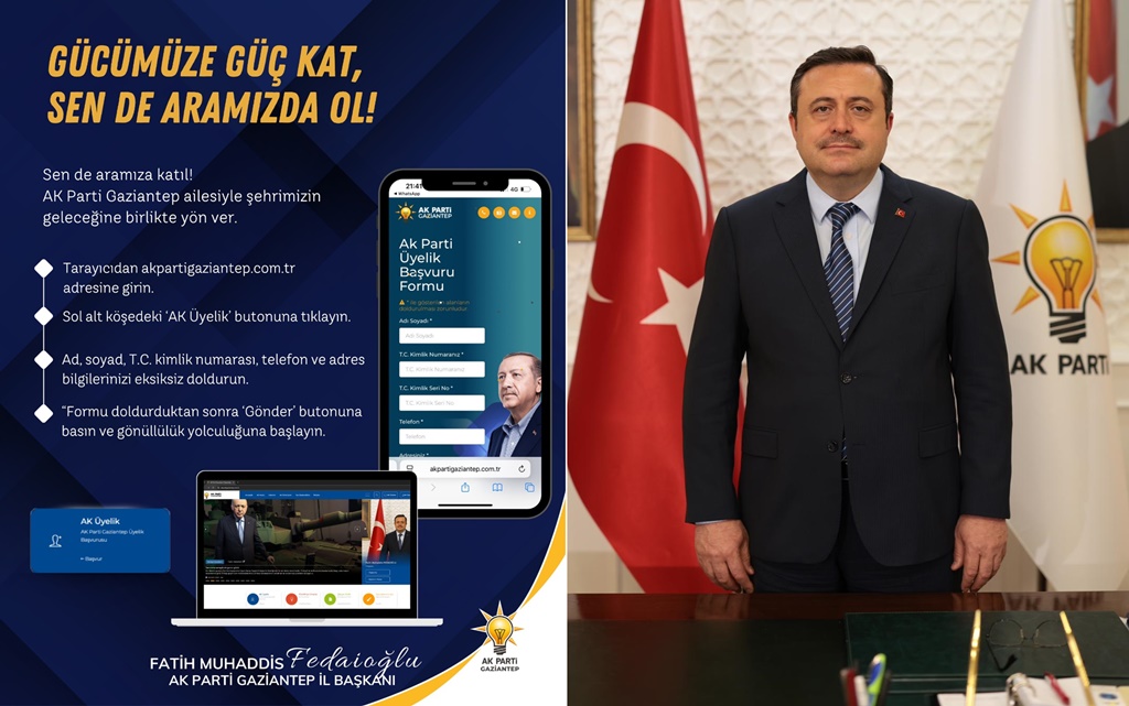 AK Parti Gaziantep İl Başkanı Fatih Muhaddis Fedaioğlu, “Cumhurbaşkanımız Recep Tayyip Erdoğan’ın liderliğinde Türkiye Yüzyılı’na ilerlerken, partimizin dijital dönüşümünü güçlendiriyoruz. Üyelik artık birkaç dakikada cep telefonu veya bilgisayar üzerinden yapılabiliyor. Bu, teşkilatımızın çağın gereklerine uyumunun somut örneğidir. Gaziantep, dijitalleşmede öncü şehir oldu. Gönül veren herkesi yeni sistemle AK Parti’ye davet ediyorum. Birlikte daha güçlü Türkiye için çalışacağız” dedi.