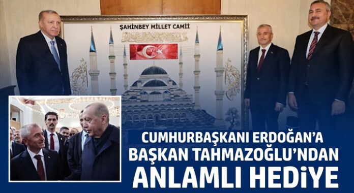 Şahinbey Belediye Başkanı Mehmet Tahmazoğlu, Ankara’da AK Parti Grup Başkanvekili ve Gaziantep Milletvekili Abdulhamit Gül ile birlikte Cumhurbaşkanı Recep Tayyip Erdoğan’ı ziyaret etti. Ziyarette, Şahinbey Millet Cami ve Külliyesi’ni konu alan özel filografi tablosunu Cumhurbaşkanı’na hediye etti.