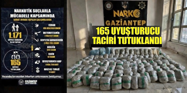 Gaziantep’te polis ekiplerinin şubat ayında düzenlediği uyuşturucu operasyonlarında 165 zehir taciri tutuklandı. Operasyonlarda yüklü miktarda uyuşturucu madde ve uyuşturucu yapımında kullanılan malzeme ele geçirildi.