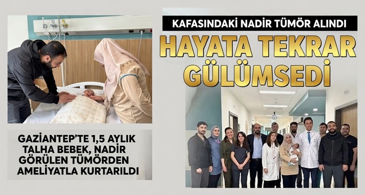 Gaziantep Şehir Hastanesi’nde, henüz 1,5 aylık olan Talha bebeğin baş bölgesinde doğuştan bulunan ve hızla büyüyen nadir bir tümör, başarılı bir ameliyatla temizlendi. Beyin ve Sinir Cerrahisi Uzmanı Op. Dr. Ali Yayla öncülüğündeki ekip tarafından gerçekleştirilen operasyon, bu tür tümörlerin bu büyüklükte ve bu yaş grubunda nadir görülen başarılı vakalarından biri olarak kayıtlara geçti.