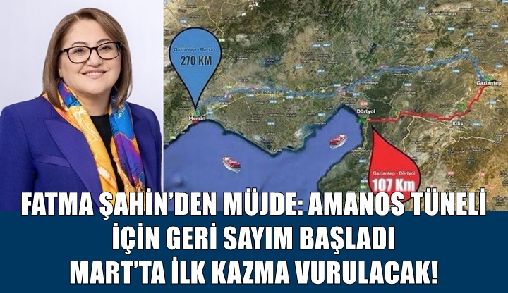 Gaziantep Büyükşehir Belediye Başkanı Fatma Şahin, bölge ekonomisi için dev bir adım olan Amanos Tüneli Projesi’nde artık icraat aşamasına geçildiğini duyurdu. Şahin, sosyal medya hesabından yaptığı paylaşımda projenin Mart ayında fiilen başlayacağını müjdeledi.