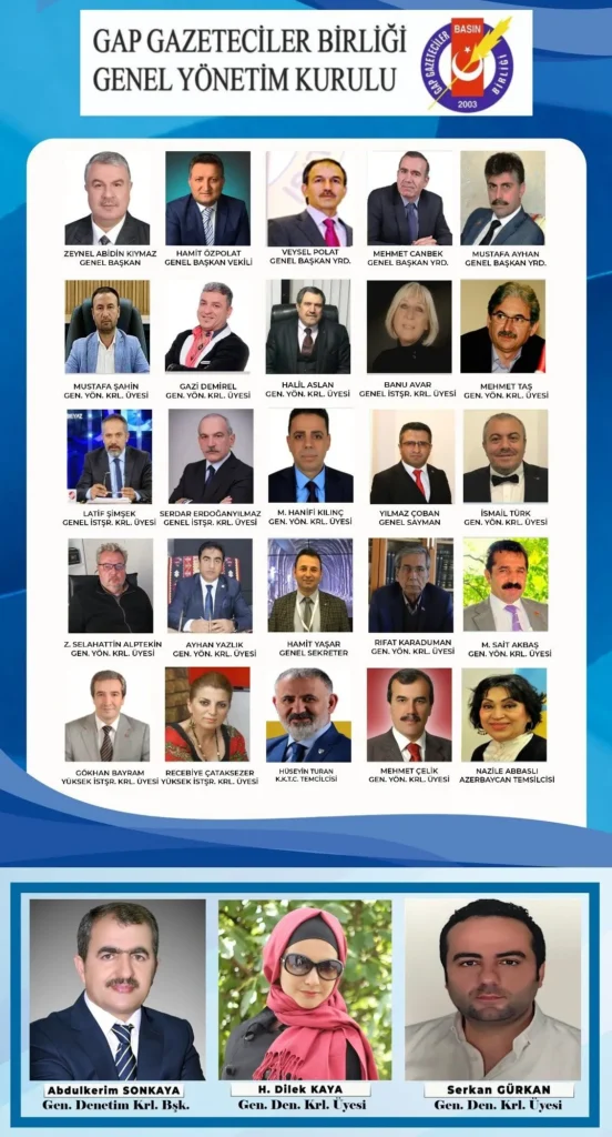 GAP Gazeteciler Birliği’nin olağan genel kurulunun ardından yeni görev dağılımı belli oldu. Olağan genel kurul sonrası 3 yıl süreyle görev yapacak isimler açıklandı. Genel kurulda güven tazeleyen GAP Gazeteciler Birliği Genel Başkanı Zeynel Abidin Kıymaz: “Yeni dönemde daha çok çalışacağız” dedi.