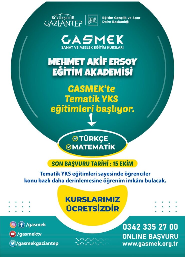 Gaziantep Büyükşehir Belediyesi bünyesindeki GASMEK’te Tematik YKS Eğitimleri başladı. Programda öğrenciler, matematik ve Türkçe derslerinde konu bazlı eğitim alarak sınavlara daha güçlü hazırlanacak.