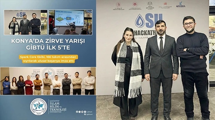 Gaziantep İslam Bilim ve Teknoloji Üniversitesi (GİBTÜ), bilim ve teknoloji odaklı vizyonunu ulusal platformlarda elde ettiği başarılarla taçlandırmaya devam ediyor. Üniversitenin teknoloji ve inovasyon alanındaki öncü öğrenci topluluklarından Spark Core ekibi, 54 farklı ilden katılımın sağlandığı Konya Su Hackathonu’nda 166 seçkin takım arasından sıyrılarak Türkiye 5.’si oldu.