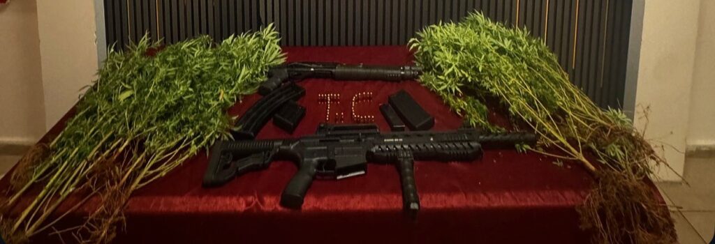 Evde yapılan aramalarda 16 kök Hint keneviri, 2 pompalı tüfek, 4 şarjör ve 36 fişek ele geçirildi, 1 şüpheli gözaltına alındı.