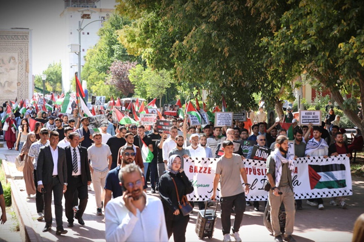 Yürüyüşün ardından öğrenciler, GAÜN Merkezi Yemekhane önünde toplandı. Burada konuşan GAÜN İlahiyat Fakültesi Öğretim Üyesi Prof. Dr. Mehmet Akbaş, “Bu, 8 milyar insanlık âleminin meselesidir. Öğrencilerimizin, Türkiye’nin ve dünyanın kıyamı bu insanlık âlemini kurtarmak içindir. Sakın vazgeçmeyin.” dedi.