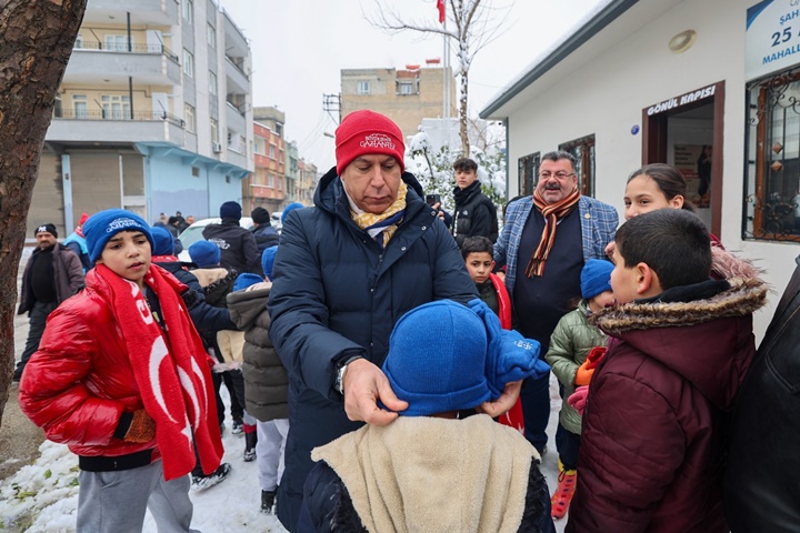 Gaziantep Büyükşehir Belediyesi, yoğun kar yağışının ardından beyaza bürünen kentte karın tadını çıkaran çocukların sevincini paylaşarak onlara atkı, bere ve eldiven hediye etti, eğlencelerine ortak oldu.