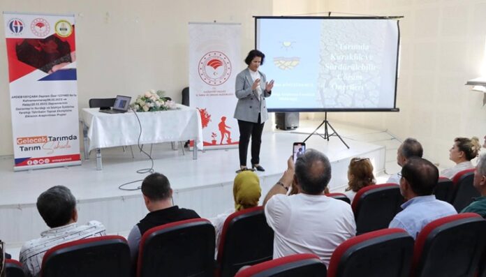 Nurdağı Belediye Salonu’nda düzenlenen seminerde, Fıstık Araştırma Enstitüsünden Dr. Serkan Kösetürkmen “Tarımda Kuraklık ve Sürdürülebilir Çözüm Önerileri” konulu sunum yaparken, Biyolog Rojda Kılınç ise “Yöresel Ürünlerde Hasat ve Sürdürülebilir Depolama” üzerine bilgi verdi.