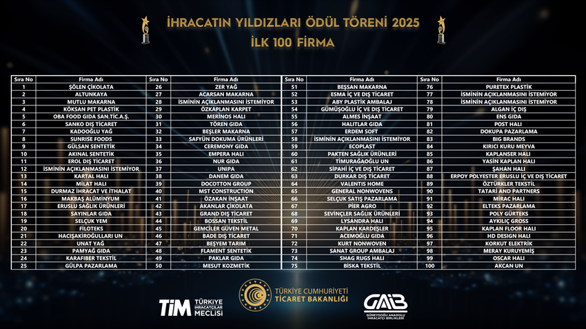 Gaziantep’te Güneydoğu Anadolu İhracatçı Birlikleri (GAİB) tarafından “İhracatın Yıldızları” ödül töreni gerçekleştirildi. 2024 yılında en fazla ihracat yapan 100 firmaya “İhracatın Yıldızı” ödülü verildi. GAİB Hizmet binasında düzenlenen tören, saygı duruşunda bulunulması ve İstiklal Marşı’nın okunmasıyla başladı.