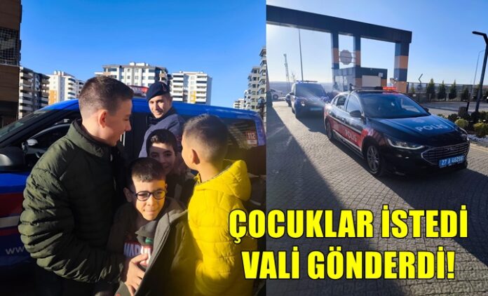 Vali Çeber’in çocuklara “Benden istediğiniz bir şey var mı?” sorusuna bazı çocuklar heyecanla “Polis arabasına binmek istiyoruz” yanıtını verdi. Bu içten ve masum istek üzerine Vali Çeber, hiç vakit kaybetmeden talimat verdi.