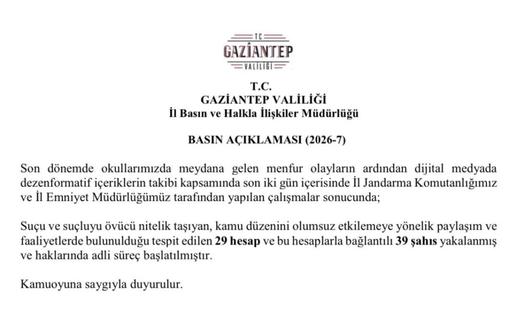 Gaziantep Valiliğinden yapılan açıklamaya göre, son dönemde okullarda meydana gelen menfur olayların ardından dijital medyada dezenformatif içeriklerin takibi kapsamında son iki gün içerisinde İl Jandarma Komutanlığı ve İl Emniyet Müdürlüğü ekipleri tarafından çalışma yapıldı.