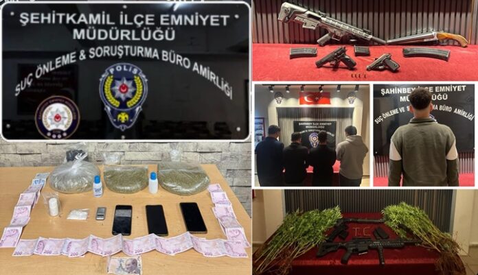 Gaziantep’in Şehitkamil ve Şahinbey ilçelerinde polis ekiplerince gerçekleştirilen çalışmalarda uyuşturucu ve silahlar ele geçirildi. Operasyonlarda toplam 9 şüpheli gözaltına alındı.