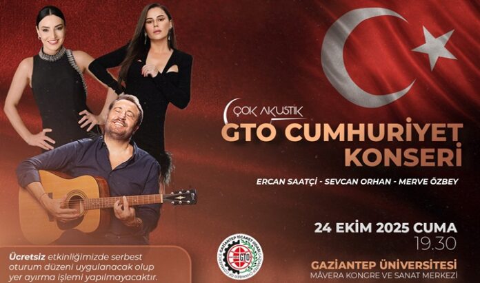 GTO’dan yapılan açıklamaya göre; Ercan Saatçi, Sevcan Orhan ve Merve Özbey’in sahne alacağı “Çok Akustik GTO Cumhuriyet Konseri” 24 Ekim 2025 Cuma günü saat 19.30’da Gaziantep Üniversitesi Mâvera Kongre ve Sanat Merkezi’nde gerçekleştirilecek.