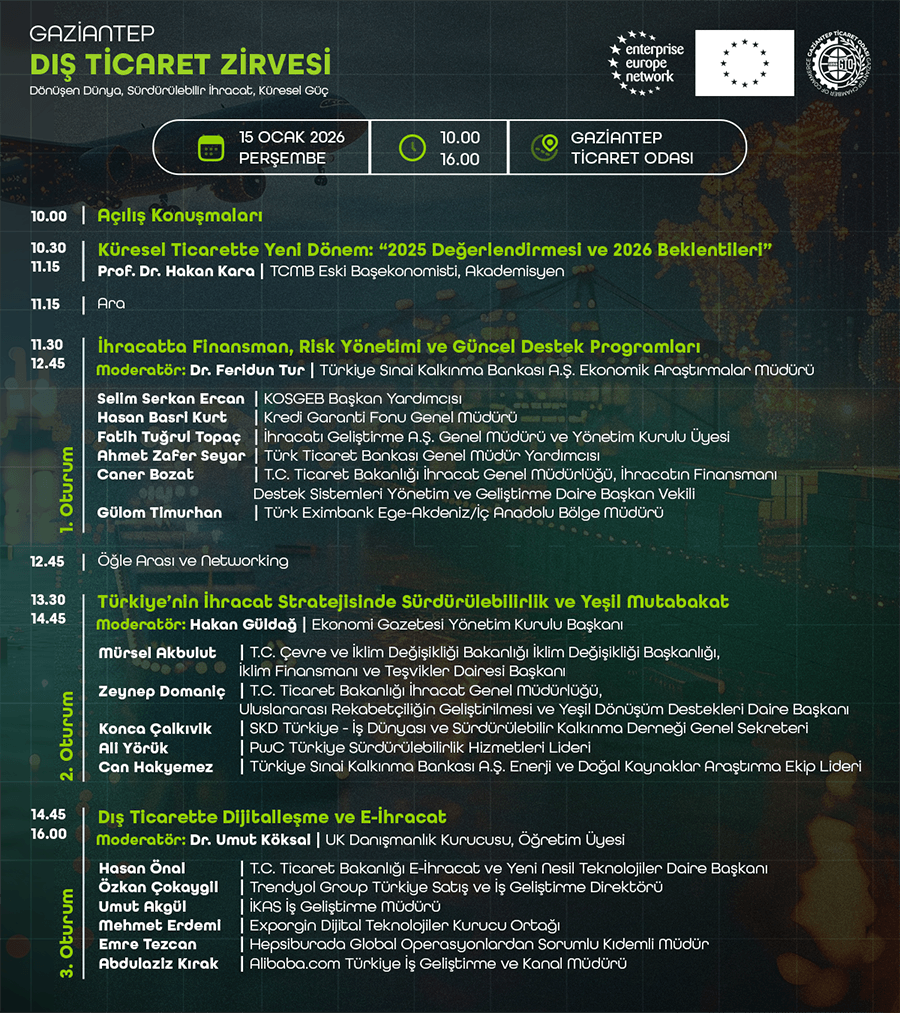 GTO’dan yapılan açıklamaya göre; 15 Ocak Perşembe günü GTO binasında gerçekleştirilecek olan Gaziantep Dış Ticaret Zirvesi’nde; Küresel ticaretin geleceği, İhracatta finansman ve risk yönetimi, Yeşil Mutabakat ve sürdürülebilir rekabet, Dijitalleşme ve e-ihracat başlıklarında, alanında uzman isimlerle birlikte bölge ihracatçıları ve firmalara öngörü kazandıran, strateji sunan oturumlar yer alacak.