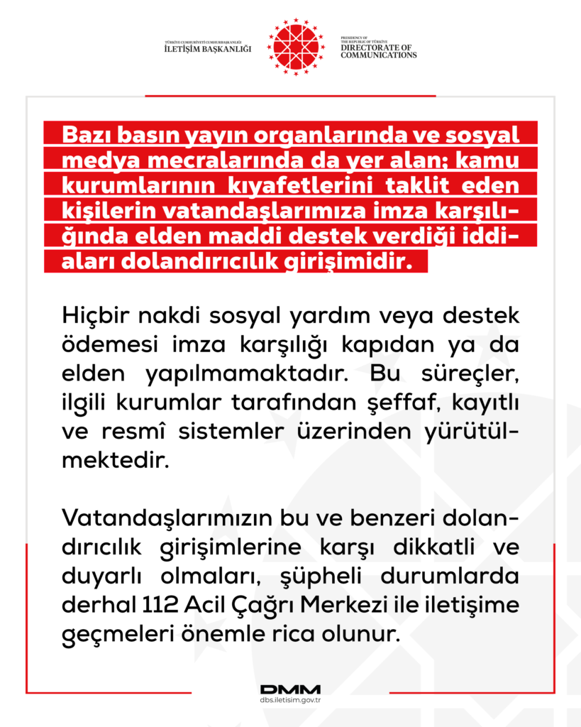 Dezenformasyonla Mücadele Merkezi’nden yapılan resmi açıklamada şu ifadelere yer verildi: “Bazı basın yayın organlarında ve sosyal medya mecralarında da yer alan; kamu kurumlarının kıyafetlerini taklit eden kişilerin vatandaşlarımıza imza karşılığında elden maddi destek verdiği iddiaları dolandırıcılık girişimidir. Hiçbir nakdi sosyal yardım veya destek ödemesi imza karşılığı kapıdan ya da elden yapılmamaktadır. Bu süreçler, ilgili kurumlar tarafından şeffaf, kayıtlı ve resmî sistemler üzerinden yürütülmektedir.”