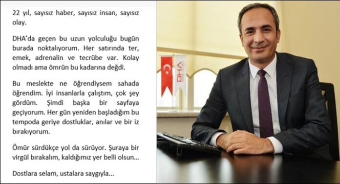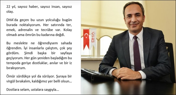 “22 yıl, sayısız haber, sayısız insan, sayısız olay. DHA’da geçen bu uzun yolculuğu bugün burada noktalıyorum. Her satırında ter, emek, adrenalin ve tecrübe var. Kolay olmadı ama ömrün bu kadarına değdi. Bu meslekte ne öğrendiysem sahada öğrendim. İyi insanlarla çalıştım, çok şey gördüm. Şimdi başka bir sayfaya geçiyorum. Her gün yeniden başladığım bu tempoda geriye dostluklar, anılar ve bir iz bırakıyorum. Ömrüm sürdüğünce yol da süreyim. Şuraya bir virgül bırakalım, kaldığımız yer belli olsun… Dostlara selam, ustalara saygıyla…”