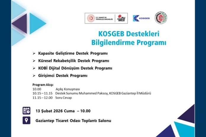 Gaziantep Ticaret Odası (GTO) ve KOSGEB Gaziantep İl Müdürlüğü iş birliğiyle düzenlenecek bilgilendirme toplantısı 13 Şubat Cuma günü saat 10.00’da Gaziantep Ticaret Odası’nda yapılacak.