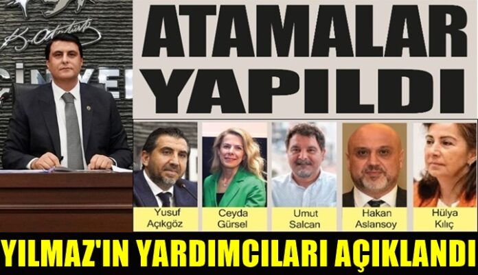 Yılmaz, kamuoyunca merakla beklenen yeni yönetim kadrosuna ilişkin de açıklamalarda bulundu. Yılmaz, 5 kişilik başkan yardımcısı kadrosunu belirlediğini ifade ederek, “Belediye başkan yardımcılıklarına Yusuf Açıkgöz, Ceyda Gürsel, Hakan Aslansoy, Hülya Kılıç ve Umut Salcan tarafımca atanmıştır. Şehrimize ve ilçemize hayırlı olsun” diye konuştu.
