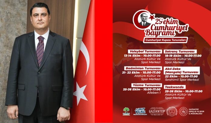 Cumhuriyet coşkusunu sporla bütünleştirmek amacıyla düzenlenen etkinlikler kapsamında; 13-14 Ekim tarihlerinde Atatürk Kültür ve Spor Merkezi’nde Voleybol Turnuvası, 18-19 Ekim tarihlerinde yine aynı merkezde Satranç Turnuvası, 21-22 Ekim tarihlerinde Badminton Turnuvası, 22 Ekim’de İbrahimli Spor Merkezi’nde Akıl ve Zeka Oyunları (Mangala) Turnuvası, 25-26 Ekim tarihlerinde Alleben 1 Yüzme Havuzu’nda Yüzme Turnuvası ve aynı tarihlerde Atatürk Kültür ve Spor Merkezi’nde Taekwondo Turnuvası düzenlenecek.
