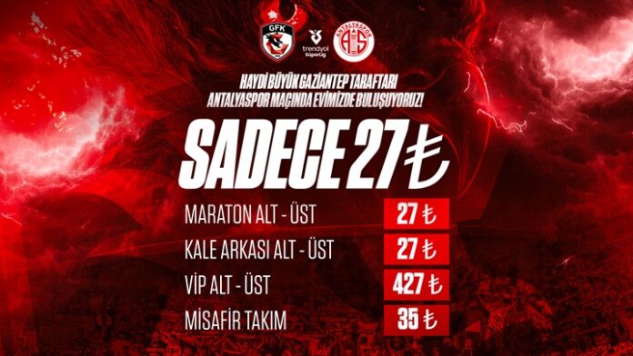 Gaziantep FK, Trendyol Süper Lig’in 9. haftasında 19 Ekim Pazar günü saat 17.00’de sahasında Hesap.com Antalyaspor ile karşılaşacak. Gaziantep Büyükşehir Stadyumu’nda oynanacak maçın biletleri satışa çıktı.
