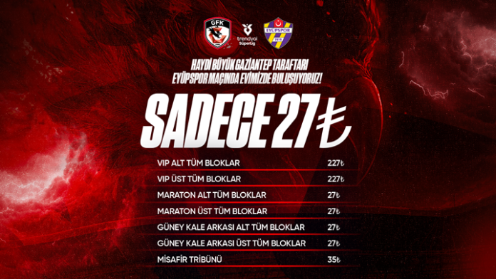 Kulüp yönetimi, taraftarlara jest yaparak Maraton ve Kale Arkası kategorilerindeki biletleri Gaziantep’in plaka kodu olan 27 TL’den satışa çıkardı. Biletlere büyük ilgi gösteriliyor; satışa çıktıktan kısa süre sonra 11 bin 505 bilet satıldı, tribün doluluk oranı yüzde 52’ye ulaştı.