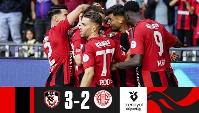 Trendyol Süper Lig’in 9. haftasında Gaziantep FK ilk yarıda attığı gollerle Hesap.com Antalyaspor’u 3-2 yendi. Kırmızı siyahlıların yenilmezlik serisi 7 maça çıktı. Kırmızı siyahlıların gollerini 4. dakikada Camara, 17. dakikada Kozlowski ve 30. dakikada Bayo attı. Antalyaspor’da Gueye 83 ve 85. dakikalarda ağları havalandırdı..