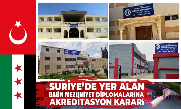 Gaziantep Üniversitesi (GAÜN)’ün Suriye’de yer alan Afrin Eğitim Fakültesi, Azez İslami İlimler Fakültesi, El-Bab İktisadi ve İdari Bilimler Fakültesi ile Cerablus Meslek Yüksekokulu’nda yürütülen eğitim programları kapsamında verilen mezuniyet diplomalarına yönelik akreditasyon kararı alındı.