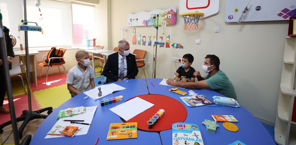 2-8 Kasım “Lösemili Çocuklar Haftası” dolayısıyla hastaneye gelen Başkan Tahmazoğlu, okul eğitimlerini hastanede sürdüren ve yatan çocuklarla yakından ilgilendi. Her birine oyuncak, boyama kitabı ve boyama seti hediye etti.