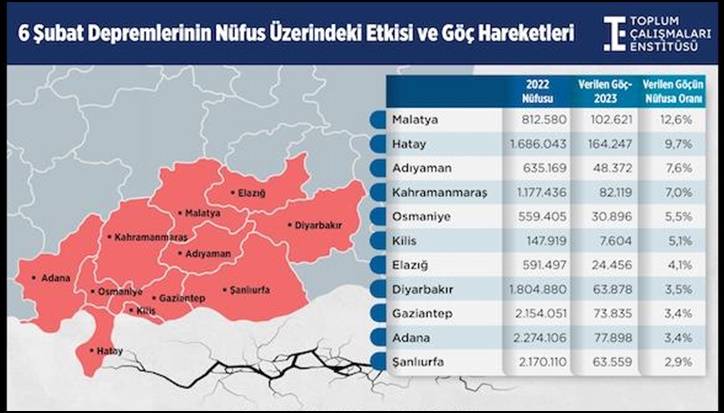 Ankara merkezli düşünce kuruluşu Toplum Çalışmaları Enstitüsü tarafından hazırlanan infografik, 6 Şubat 2023’te meydana gelen ve toplamda 11 ilde ağır yıkımlar yaşatan Kahramanmaraş merkezli depremlerin ardından depremden etkilenen illerde yaşanan göç hareketliliğini çarpıcı verilerle ortaya koydu.