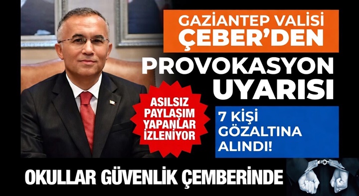Gaziantep Valisi Kemal Çeber, okul isimleri verilerek vatandaşları korku ve paniğe sevk etmeyi amaçlayan paylaşımların takip edildiğini belirterek, şu ana kadar 7 hesap ve bu hesaplarla bağlantılı 7 kişi hakkında tespit yapıldığını, bu kişiler hakkında adli sürecin başlatıldığını bildirdi.