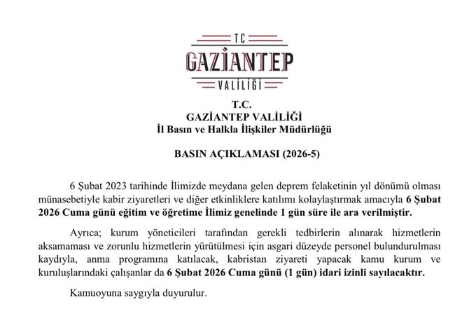 Gaziantep Valiliğinden yapılan açıklamada, 6 Şubat 2023 tarihinde ilde meydana gelen deprem felaketinin yıldönümü sebebiyle kabir ziyaretleri ve diğer etkinliklere katılımı kolaylaştırmak amacıyla 6 Şubat Cuma günü eğitim ve öğretime il genelinde 1 gün süreyle ara verileceği bildirildi.