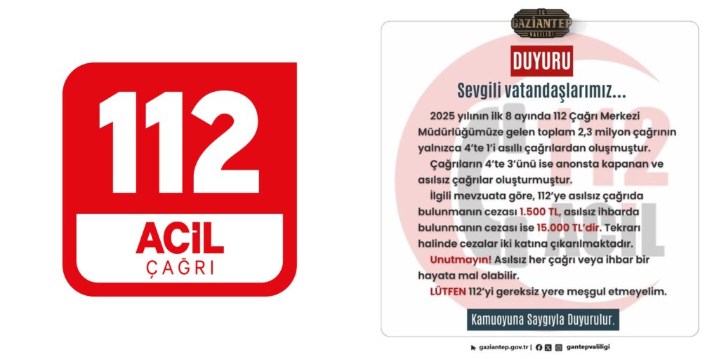 Gaziantep Valiliği, 2025 yılının ilk 8 ayında 112 Acil Çağrı Merkezi’ne gelen 2,3 milyon çağrının yalnızca dörtte birinin gerçek olduğunu açıkladı. Çağrıların dörtte üçünü anonsta kapanan ve asılsız ihbarlar oluştururken, bu durumun acil müdahaleleri geciktirebileceği vurgulandı. Valilik, vatandaşları gereksiz çağrılardan kaçınmaya çağırdı.